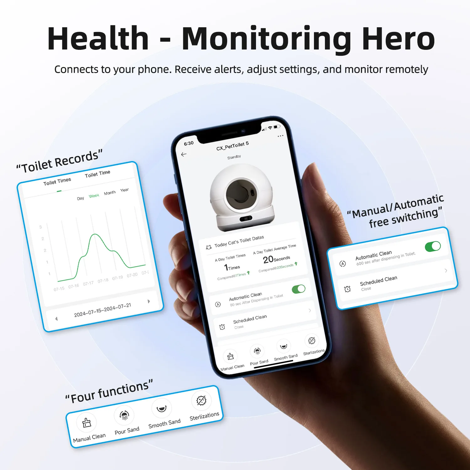 Control your cat's comfort with ease using the app on your smartphone. This smart device ensures hassle-free management.